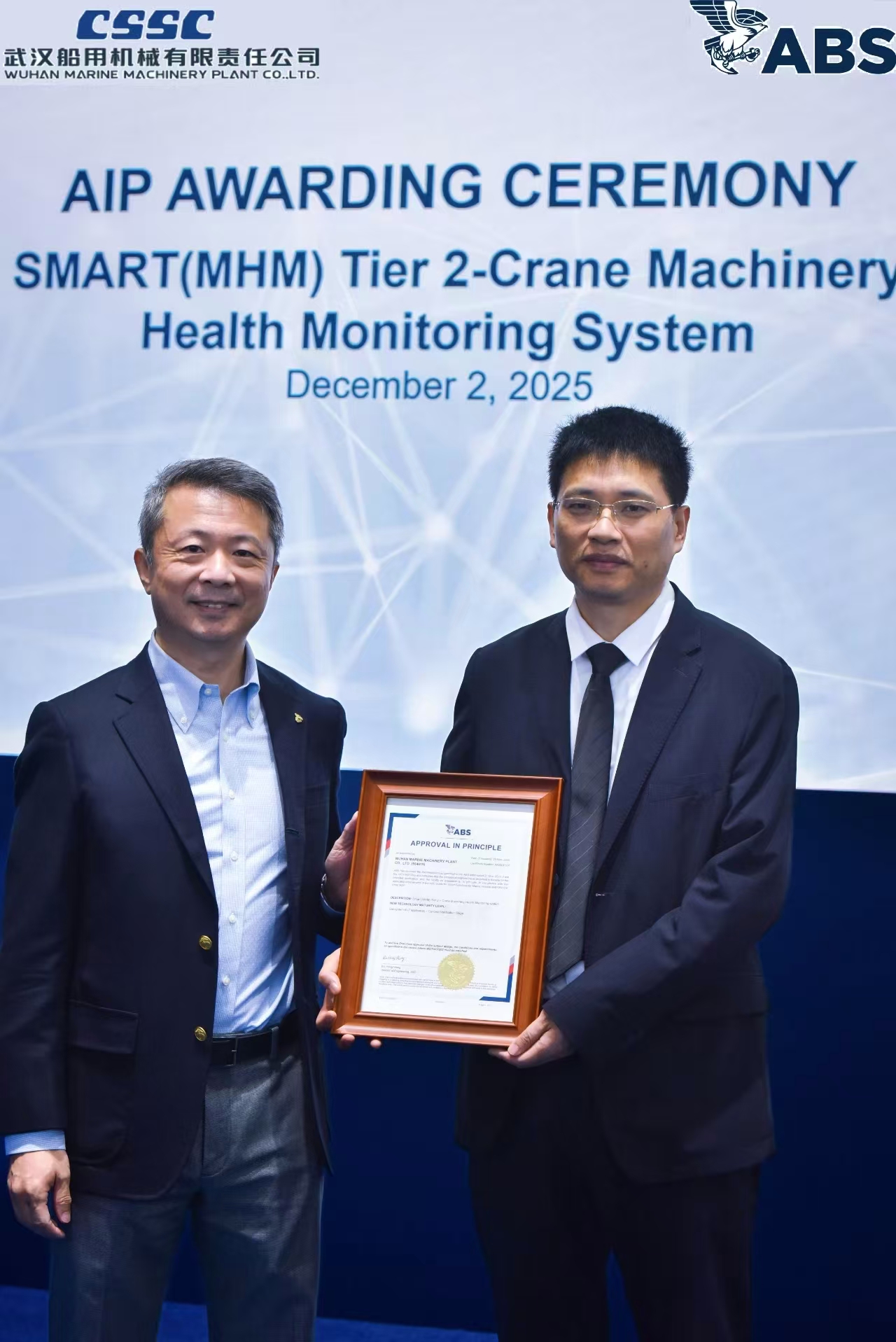 12月2日,2025年中國國際海事技術(shù)學(xué)術(shù)會(huì)議和展覽會(huì)開幕首日,中船武漢船機(jī)開發(fā)的海工吊機(jī)智能化健康監(jiān)測系統(tǒng)(SMART系統(tǒng))獲得ABS船級社SMART(MHM TIER 2)原則性批準(zhǔn)(AIP),這是國內(nèi)海工吊機(jī)首個(gè)成功取得該AIP認(rèn)證的系統(tǒng)。ABS船級社技術(shù)副總裁谷海、中船武漢船機(jī)副總經(jīng)理胡發(fā)國出席發(fā)證儀式。